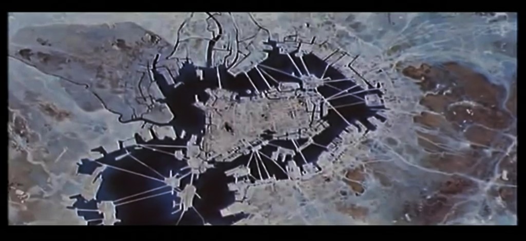 Kenzo Tange’s separately published A Plan for Tokyo, 1960 – Toward a Structural Reorganization, shared with the conference a radical and hypothetical plan for future urban development of the Tokyo bay. Shown in the picture above, this beautiful plan is fantasy. By size alone (16 miles at the widest points) this would represent an incredible engineering feat. The plan called for hundreds of enormous floating units hundreds of yards wide, connected by interwoven loops of highway and rail. This plan is likely a source of inspiration for the design of Neo Tokyo in Akira アキラ, as see in a still from the film’s opening sequence:
