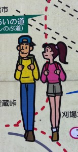 A man and woman hiking: detail from a hiking map of the area near Ashigakubo Station, in Saitama, west of Ikebukuro Station. See: Tokyo hiking: Murayama Mountain 丸山 , Ashigakubo Station 芦ヶ久保駅