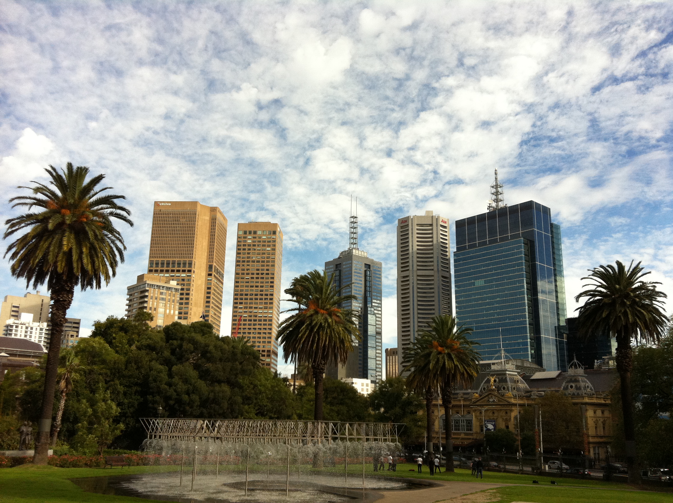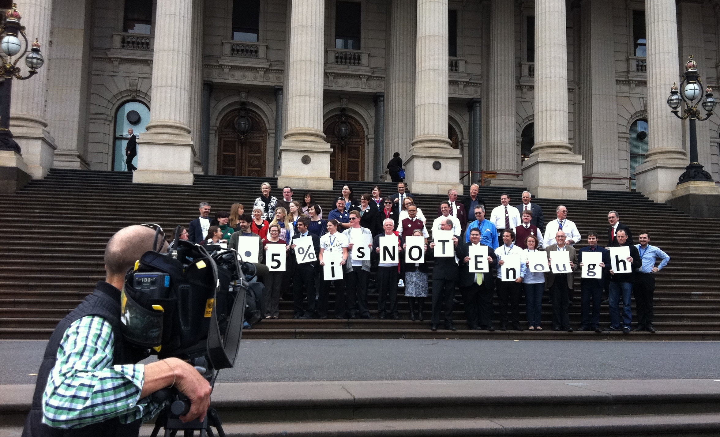 I left the tram and walked Church Street north to Bridge Road (map) where I rode a tram west, back towards Center City. I strolled through Simpson and Hotham Streets (map), home to some particularly interesting Victorian architecture, and entered the peaceful Fitzroy Gardens and adjoining Treasury Gardens (map). Just up the hill I failed to enter the Victoria State Parliament House, as it was in session. However, I was one of roughly 12 people to witness a mild protest forming on the building’s front steps, the participants carrying cards that spelled the slogan “5% is not enough” or maybe “0.5% is not enough”. Despite the presence of a television crew this appears to be a particularly ineffective protest, as the phrase barely shows up in Google results. Also, the protestors appeared rather cheerful.