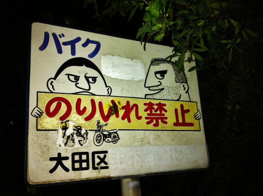 And just like that I pass a kōban 交番 (9) and I’m back on the quiet of the the Old Tokaido; within a mile I will leave the ancient street (10), turning towards the coast when I reach the Nomigawa 呑川. I am surprised when I encounter the Jack Nicklaus Academy of Golf (11), but soon I am enveloped by the deafening yet comforting cries of cicadas, the universal soundtrack of summer. I pass small warehouses so old they could pre-date the war (12). Google maps somehow knows everything and guides me through a narrow opening between two houses (13), an act that makes me feel vaguely suspect, a feeling reinforced by a sign warning of people like me.