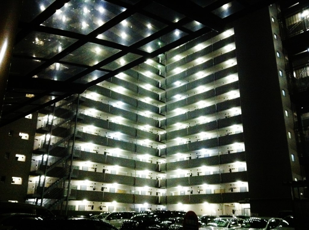 The excitement recedes as I continue along the road. I was too embarrassed to take any photographs, and I’m upset that I lost the chance to record some unique memories, but happy that I didn’t intrude on their ritual any more than I already had. I cross under a gate (7) that marks the end of the Samezu shopping district, and in a mile I’m back on a major road (8), a Royal Host restaurant brightly lit across the street, its ample parking a mark of distinction in Tokyo’s cramped confines. The buildings are large and inhuman, at least compared with the Old Tokaido. I’m reminded I have a flight to catch and google maps tells me I’m on pace for a 4:50 arrival, later than I want. Yet I can’t stop myself from taking pictures when something as beautifully ugly as this apartment complex catches my eye.