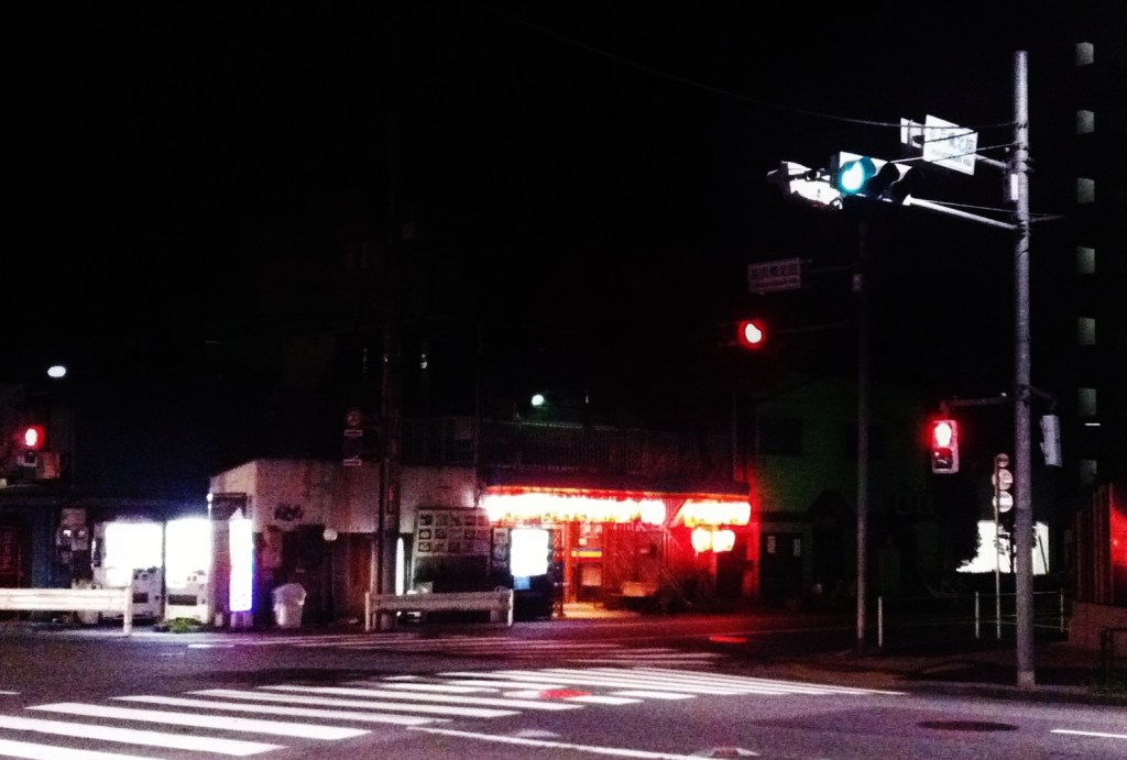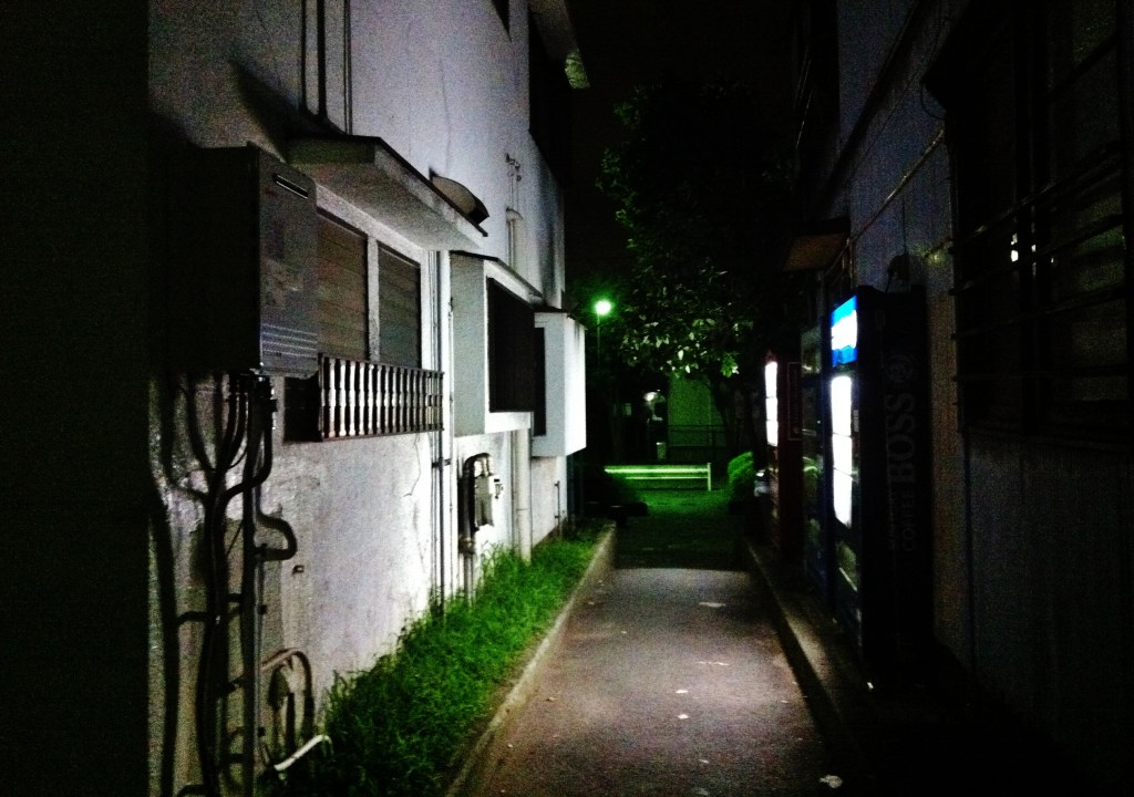 The complexion of my journey has changed from a hike to a stroll – ハイキング to 散歩. I’m surprised it’s 2:15 a.m. and I’m not the only person haunting this street. A pack of teenagers sit on a curb laughing and talking to a passerby; a family of 4 bikes past me, the 8-year-old son leading the pack. A large bronze Buddha (6) peeks out from inside his perch in Shinagawa Temple 品川寺.