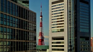 A view of Tokyo Tower, with Mt. Fuji in the background.