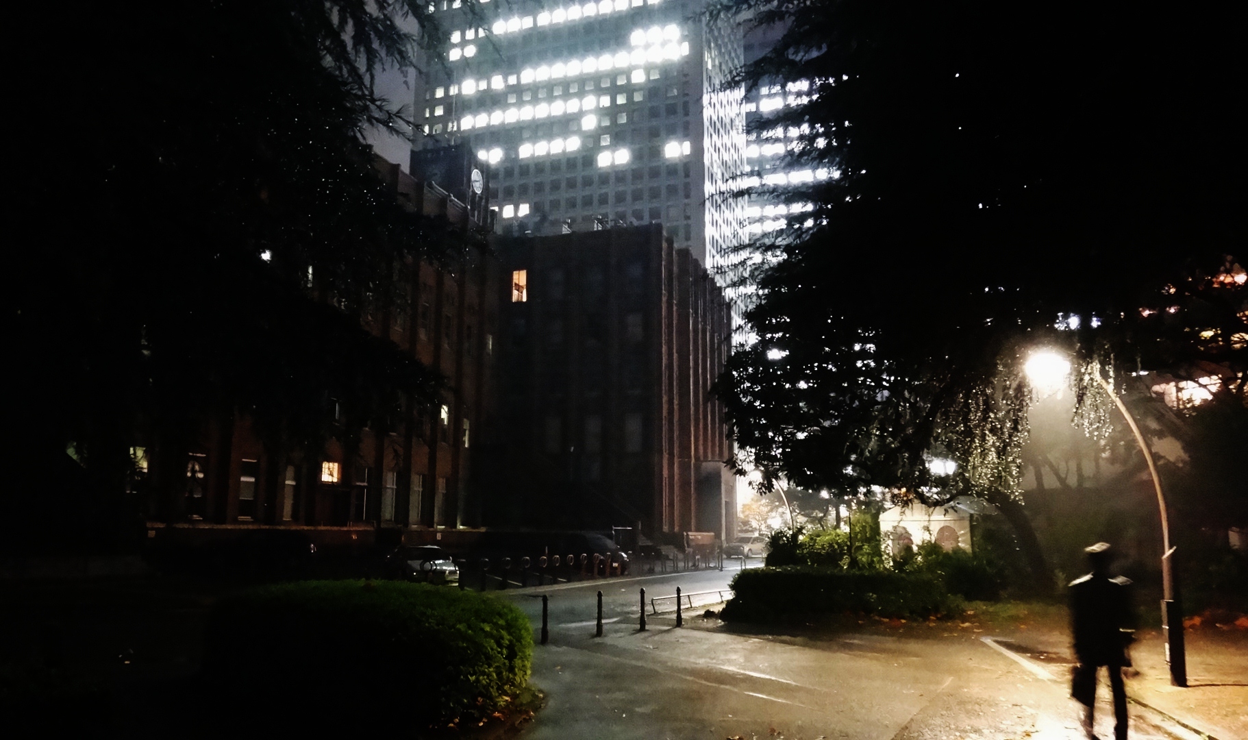 A man stands under a lamppost at night, near Hibiya Hall in Tokyo. From the photo series: November in 30 pictures.