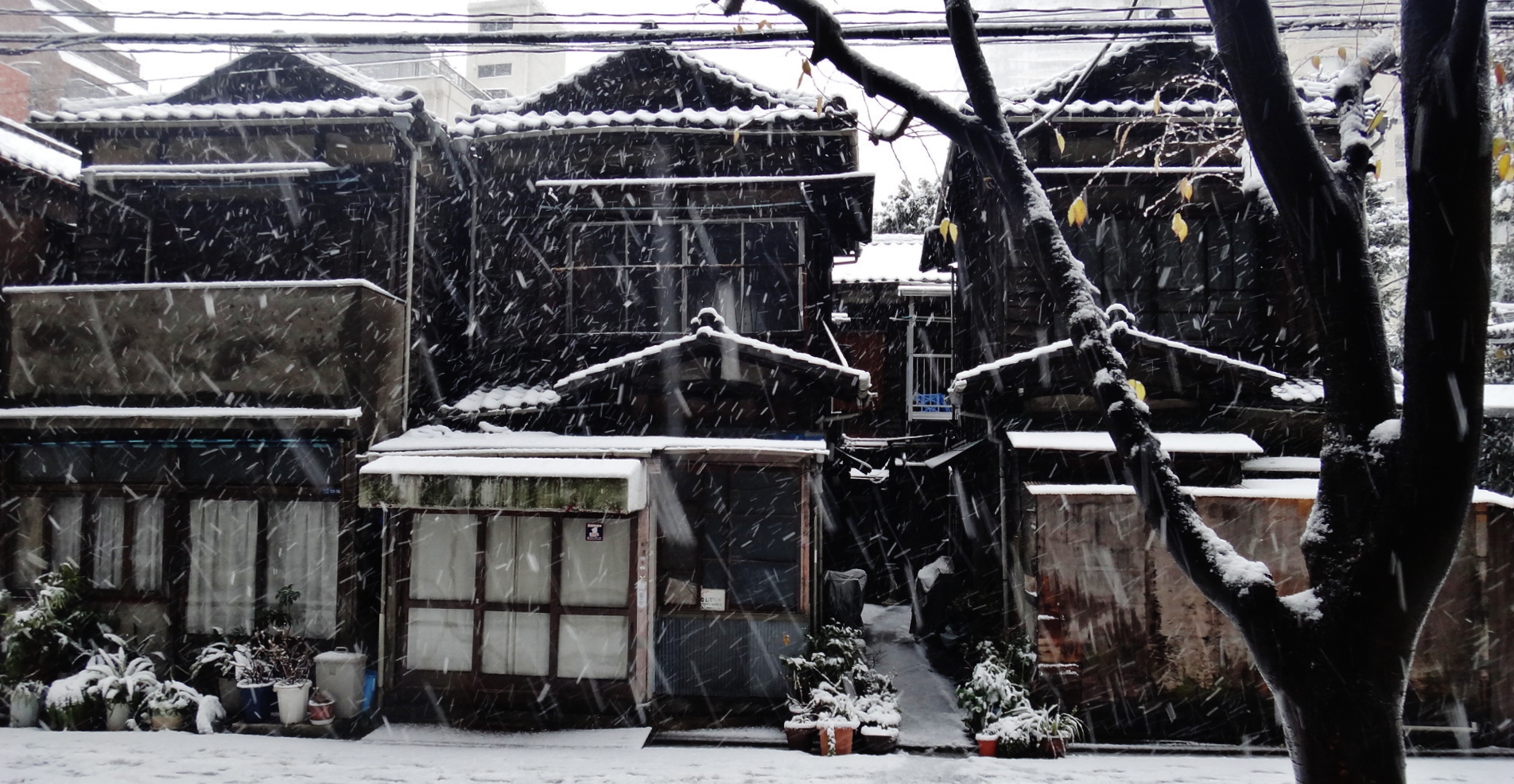 A row of old houses in the snow, between Kamiyacho station and the Atago Hill tunnel. See more pics of Tokyo in the snow: Another snowy day in Tokyo 東京の別の雪の日