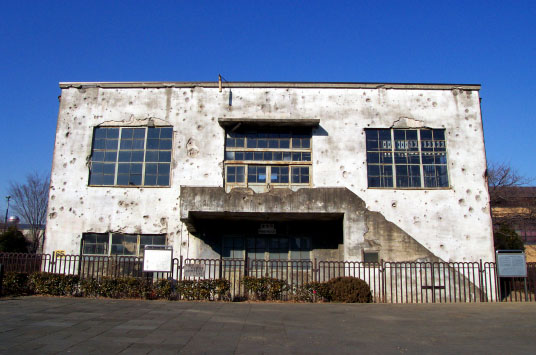 If bombs don’t make you happy, happy, head west to Tamagawa-Jōsui 玉川上水駅, about 1 hour from Tokyo station, and count the bullet holes on the Hitachi Aircraft substation, which was strafed by American gunfire during the war. The building, which supplied power to an airplane engine factory, was attacked three times in 1945: February 2 by Grumman F6F Hellcats, April 19 by P-51 Mustangs, and April 24 by B-29 bombers. The adjacent factory was destroyed by the raids, but the substation, despite absorbing considerable machine-gun damage, supplied electricity to the rebuilt factory until 1993.