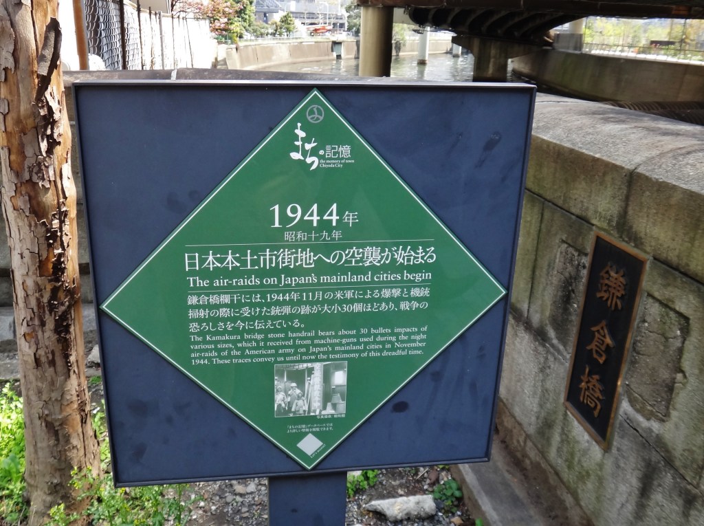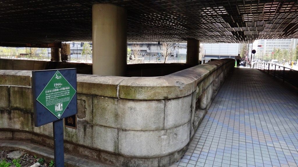 The final spot on this list goes to the most centrally-located: Kamakura-bashi (bridge) 鎌倉橋. This stone bridge in central Tokyo bears the scars of American air-raids carried out in November 1944. Although there are traces of about 30 bullets, the evidence can be confused for the natural wear and tear of an old structure; I wouldn’t have noticed the bullet marks had it not been for the historical marker that commemorates the site.