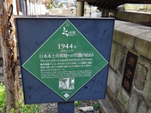 Sign explaining the bullet holes on the stone of Kamakurabashi Bridge, near Nihonbashi, in Tokyo. See: Tokyo’s archaeology of World War II 東京の第二次世界大戦の考古学 (WW2 sites)