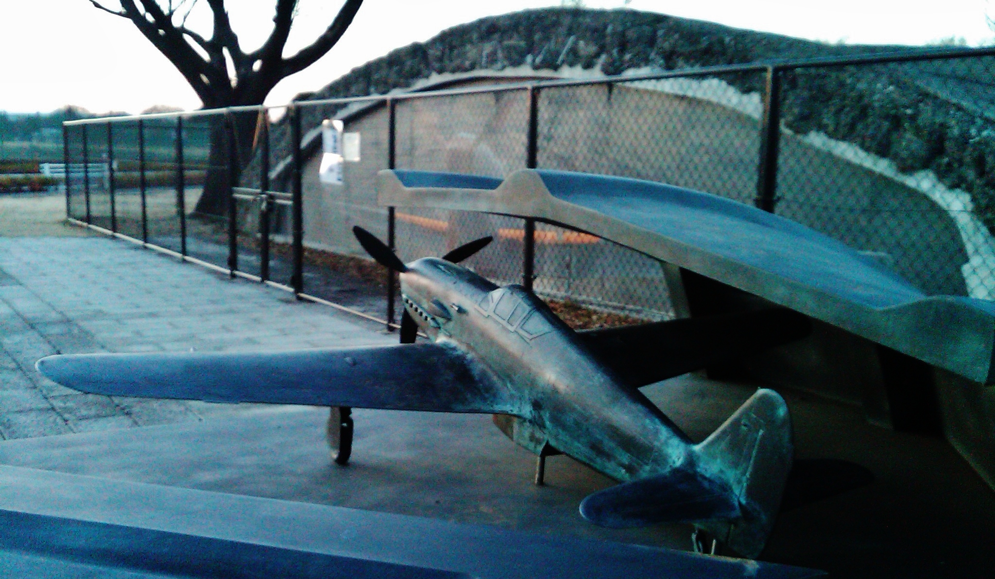 Model of a Kawasaki Ki-61 Hien “flying swallow”, a.k.a. Ki-61 “Tony”) at the OHSAWA Wartime Concrete Aircraft Hangars in outer Tokyo. See: Tokyo’s archaeology of World War II 東京の第二次世界大戦の考古学 (WW2 sites)