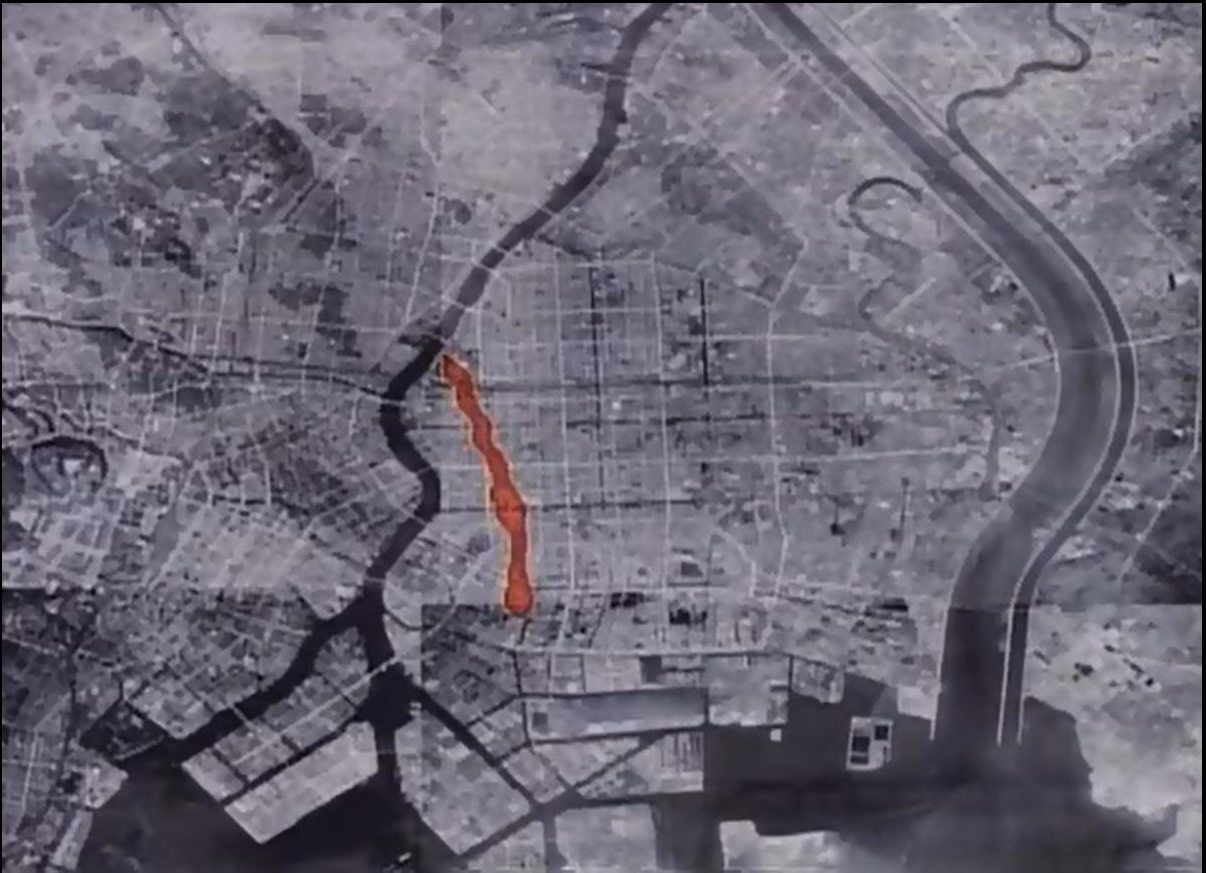 Map of firebombing damage, centered on the Koto-ku area of Tokyo. This image depicts the first wave of damage, shown in red. (For reference, the Imperial Palace is at the extreme left of the photo.) In this image, Koto-ku is bound by two rivers: the Sumida-gawa to the west and the wide Arakawa to the east.