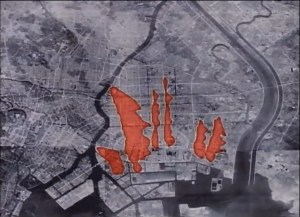 Map of firebombing damage in the Koto-ku area of Tokyo. (For reference, the Imperial Palace is at the extreme left of the photo.)