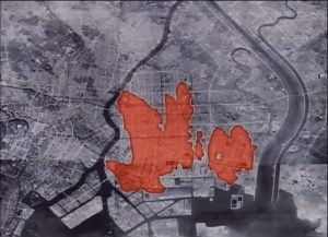Map of firebombing damage in the Koto-ku area of Tokyo. (For reference, the Imperial Palace is at the extreme left of the photo.)