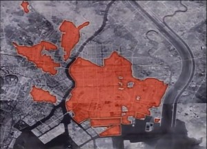 Tokyo air-raids, firebombing damage map, centered on Koto-ku. See: Tokyo’s archaeology of World War II 東京の第二次世界大戦の考古学 (WW2 sites)