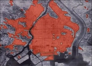 Map of firebombing damage, centered on the Koto-ku area of Tokyo. (For reference, the Imperial Palace is at the extreme left of the photo.) In this image, Koto-ku is bound by two rivers: the Sumida-gawa to the west and the wide Arakawa to the east.