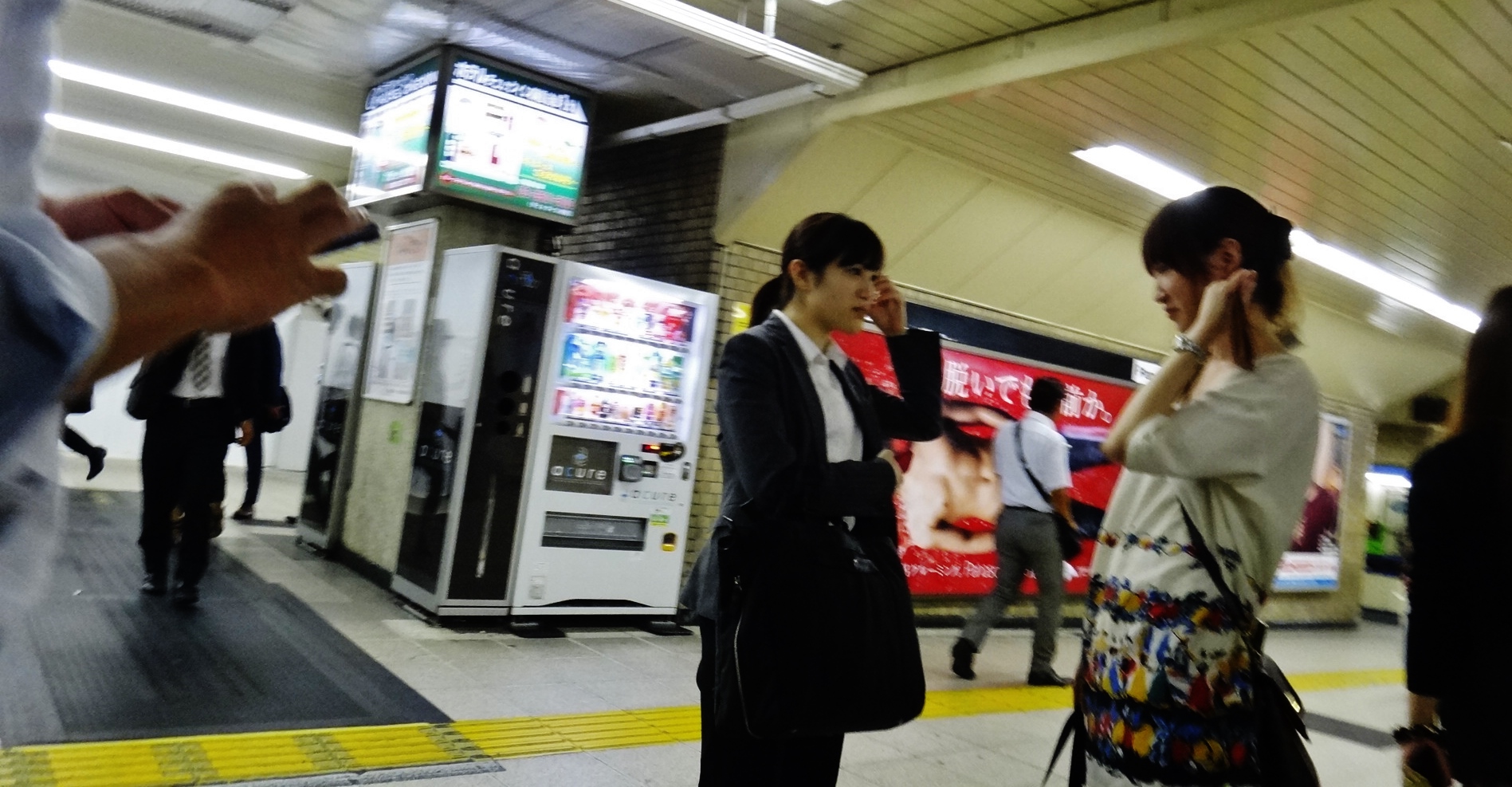 Two women in Shimbashi station, Tokyo. Notice the ‘mirroring’ behavior, in which they subconscious are both holding their left hands to their hair / ears.