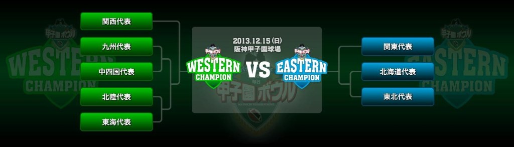 In the Tokyo area, there are two leagues that engage in high-level American football, the professional X League and the amateur Kanto League, which comprises universities in the Kanto region. The X League champion is crowned in mid-December in the Japan X Bowl; meanwhile, teams from the Kanto League must first pass through the Kanto University American football championship 関東大学アメリカンフットボール選手権 (aka the Azuma Bowl あずまボウル). The Kanto champion then battles with other Eastern Japan teams prior to competing in the Kōshien Bowl 甲子園ボウル, which is the national championship for college football in Japan, also played in mid-December (held in 2013 for the 68th year).