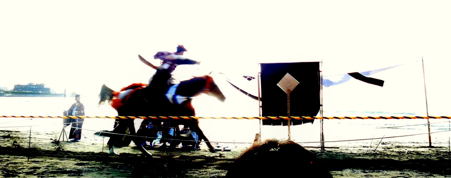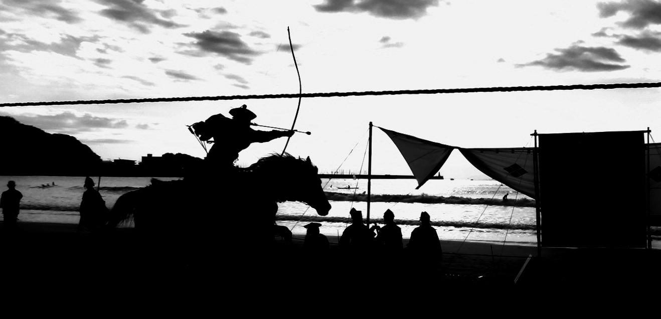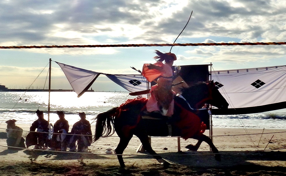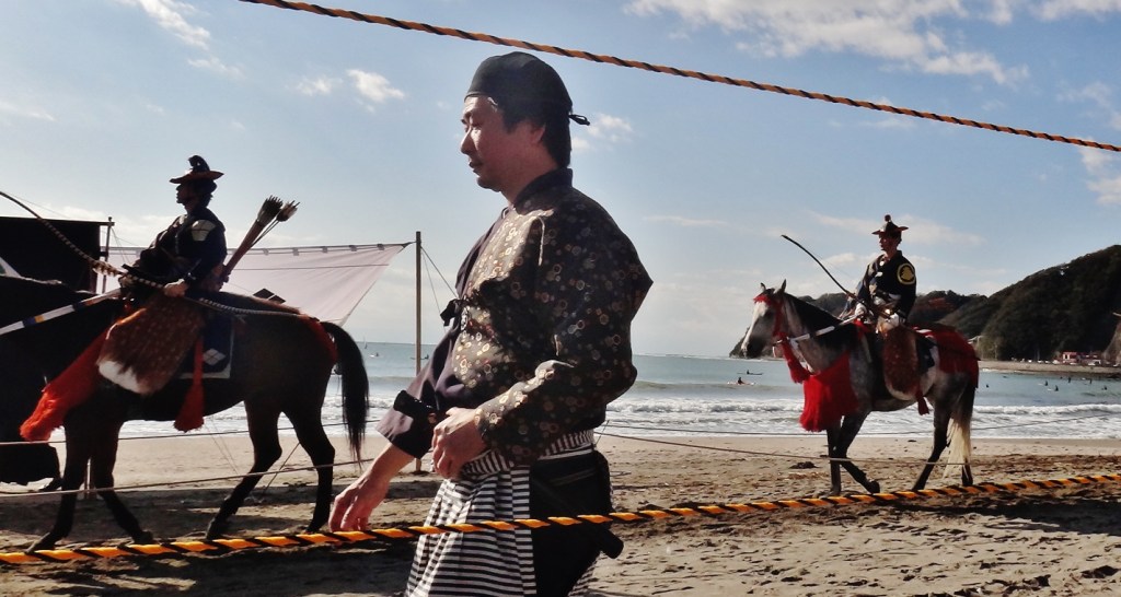 The yabusame tournament in Zushi 逗子市 is held on a pleasant beach, itself worth the 90-minute trip from Tokyo. In addition to being rooted in hundreds of years of tradition, the Zushi tournament highlights the ties binding Japan and America in the Miura Peninsula 三浦半島. The peninsula is dominated by the presence of Yokosuka Naval Base, which has been operated by the United States since 1945. After the war, U.S. military personnel learned yabusame from the locals, and in 1948 they held the first U.S.-Japan Friendship Yabusame Archery Competition*. When I attended in 2012, the event was kicked-off by a high-ranking official from Yokosuka. His speech was delivered in Japanese, a fine gesture, even if his Japanese was not.