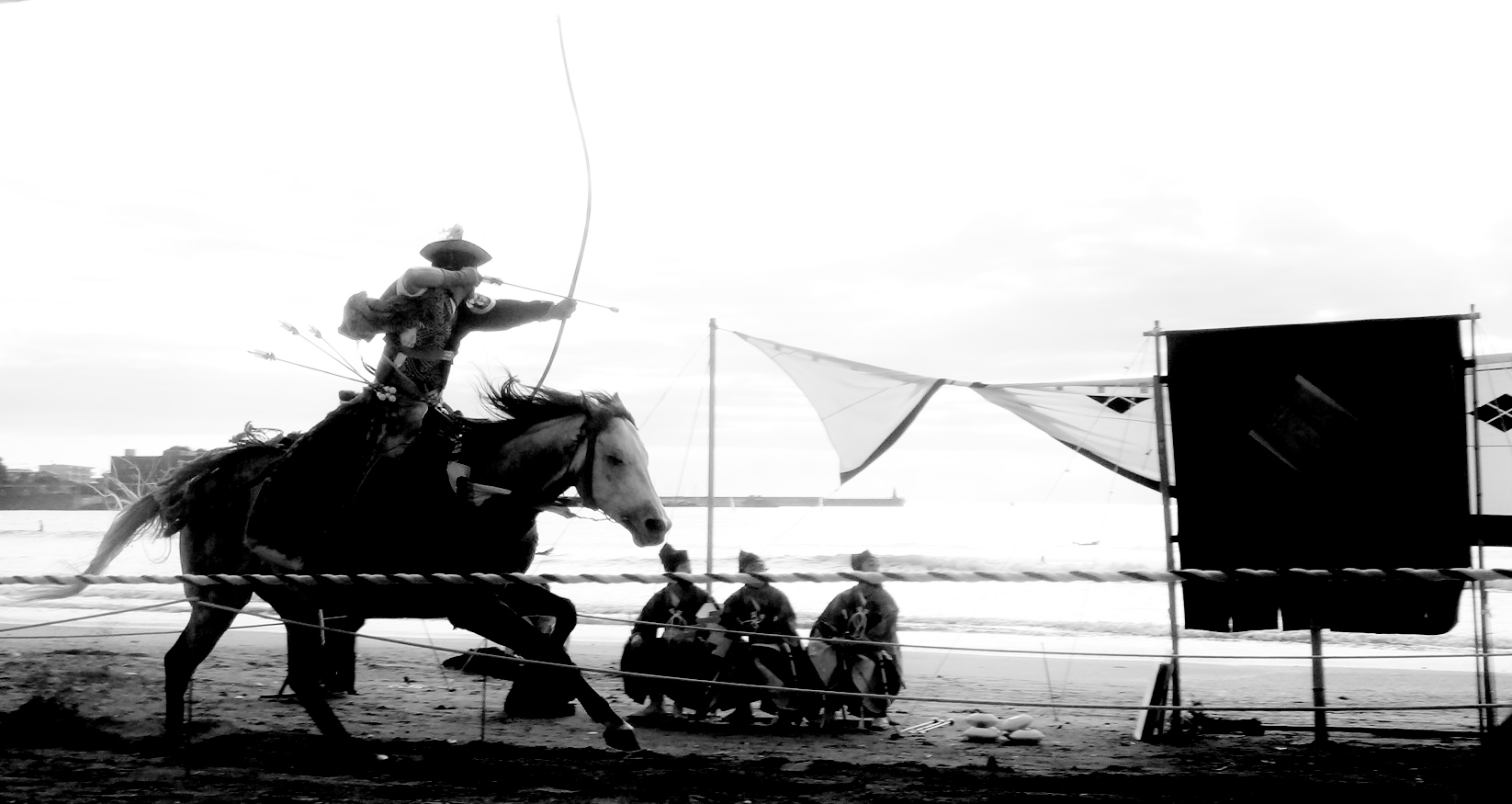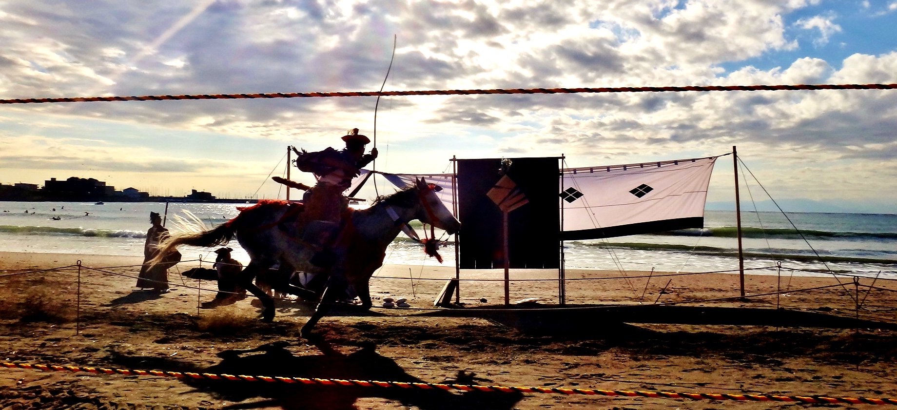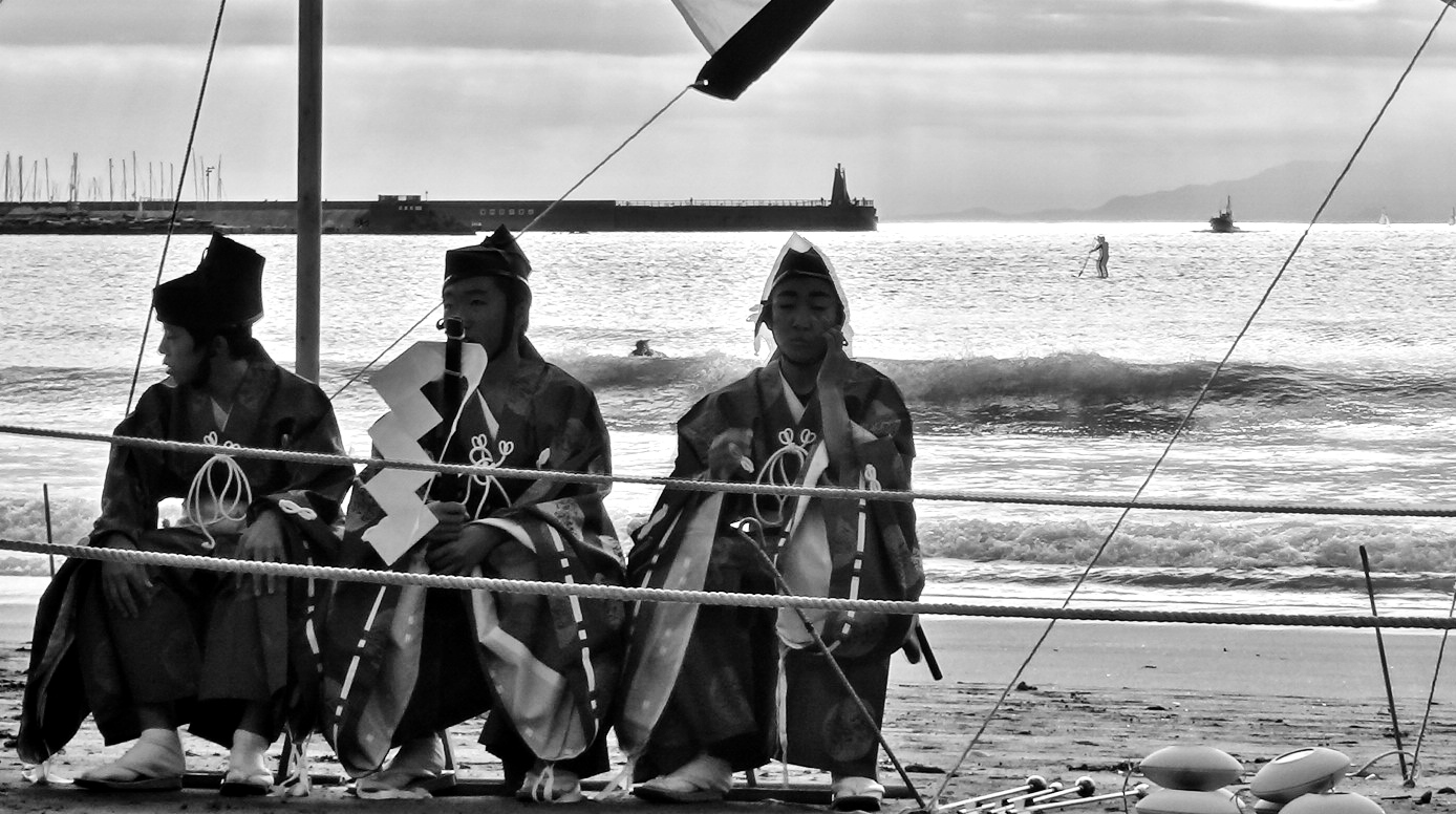 The yabusame tournament in Zushi 逗子市 is held on a pleasant beach, itself worth the 90-minute trip from Tokyo. In addition to being rooted in hundreds of years of tradition, the Zushi tournament highlights the ties binding Japan and America in the Miura Peninsula 三浦半島. The peninsula is dominated by the presence of Yokosuka Naval Base, which has been operated by the United States since 1945. After the war, U.S. military personnel learned yabusame from the locals, and in 1948 they held the first U.S.-Japan Friendship Yabusame Archery Competition*. When I attended in 2012, the event was kicked-off by a high-ranking official from Yokosuka. His speech was delivered in Japanese, a fine gesture, even if his Japanese was not.