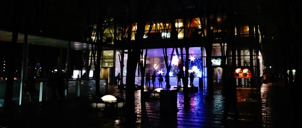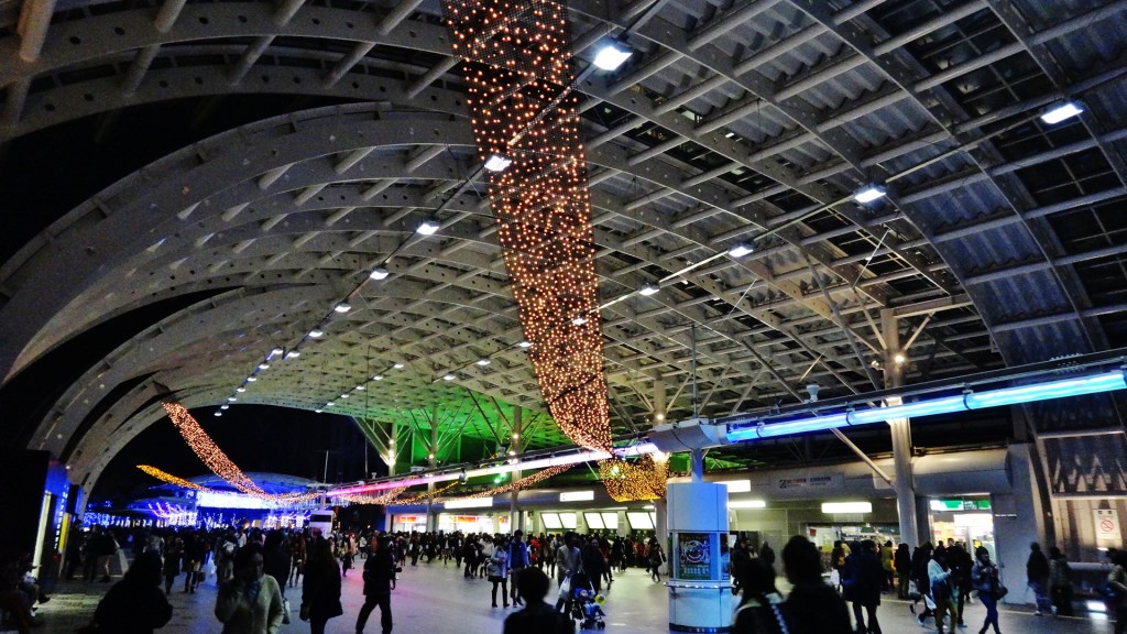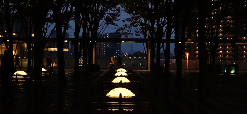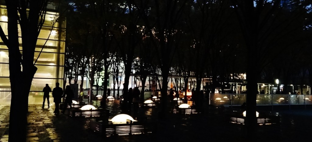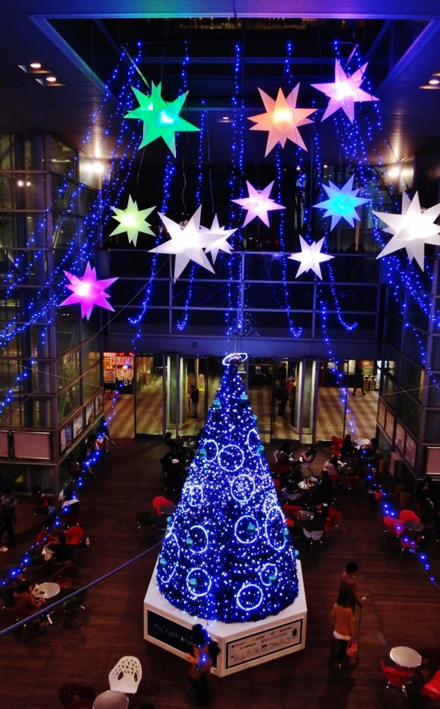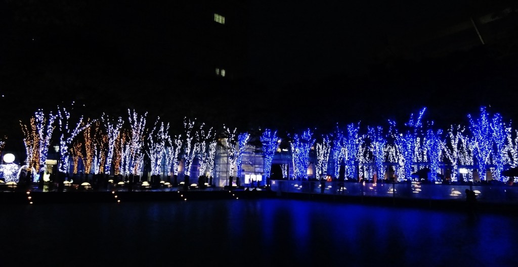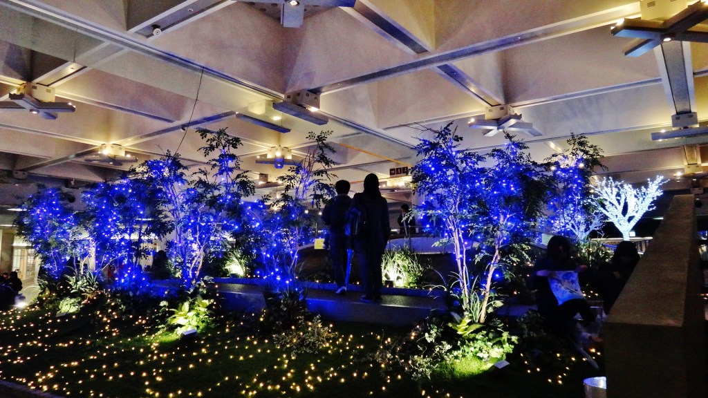 On my first visit, as dusk turned to night, the plaza was transformed by thousands of Christmas lights, an annual tradition that now seems more popular in Japan than in the West. At the Keyaki Hiroba Plaza, the lights are on display from November through mid-February, called “Blue Lights Symphony” in 2013, and “Dance with Twinkle Lights” in 2015.