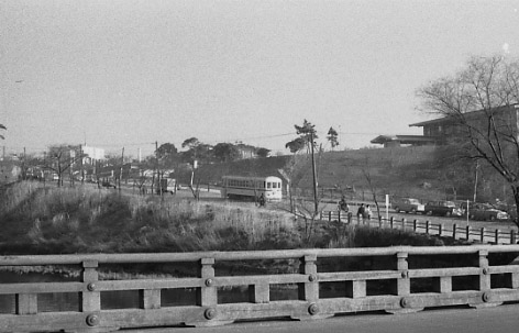 Taken from the top of Benkei-bashi bridge 弁慶橋, we see a hill near today’s exit 5 of Nagatachō Station 永田町駅, near Akasaka-Mitsuke intersection. Climbing the hill appears to be an old Toden electric streetcar. On top of the hill, at right, is the official residence of the Japanese House of Representatives. See: Times have changed: Akasaka Mitsuke (1949, 1963, 2013) 赤坂見附 交差点