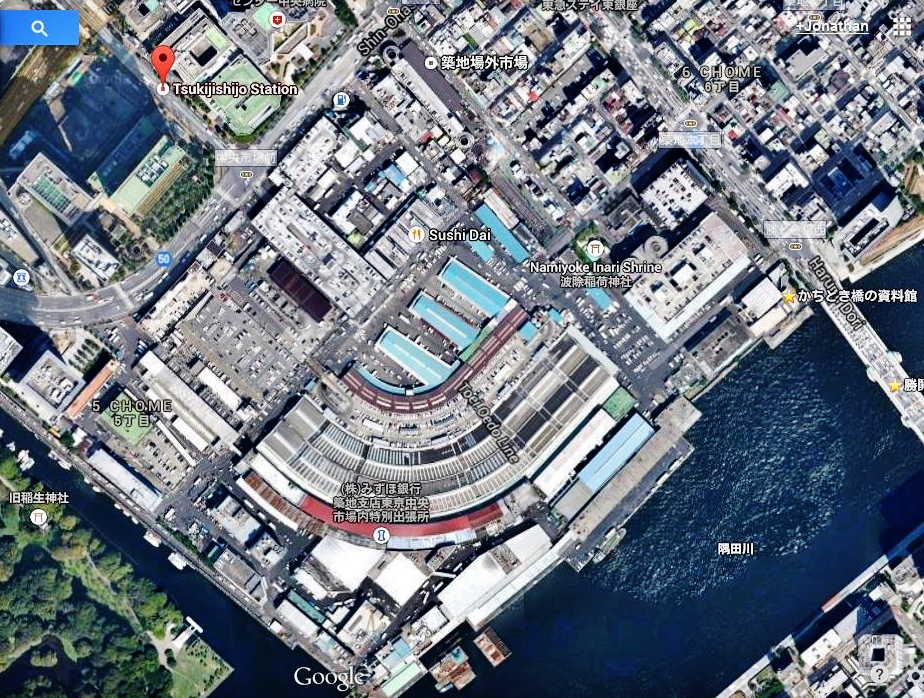 The following map (below, left) is located outside the market and is worth printing. The main roads are at the left and bottom of the map, the fish market is shaded in blue, and the five entrances are shaded in yellow. (Note: this map is oriented with south at the top. In comparison, the aerial google map (below, right) is oriented with north at top.)