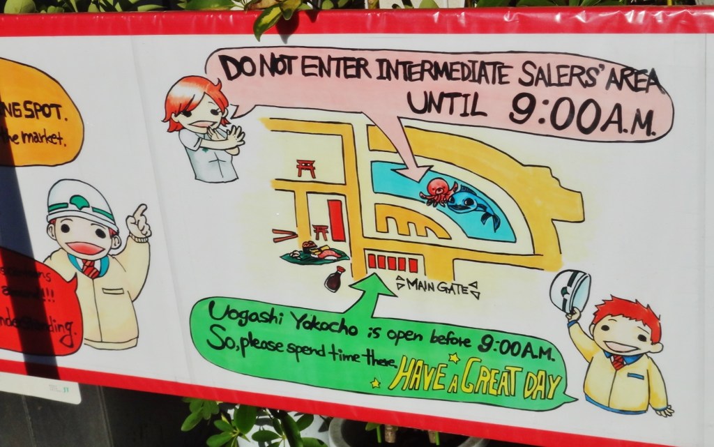 There are two things that tourists generally want to see, the “tuna auction” and the “regular fish market”. The tuna auction starts ridiculously early, like 4 or 5 a.m. I’ve never been. The regular fish market is sufficiently interesting and opens to tourists at 9:00 a.m. This is posted on a sign in front of the market (see picture below) and was confirmed by my friends during their July visit to Tsukiji. Also, the Uogashi Yokocho shopping / restaurant area (aka Fish Alley) is open before 9:00 am.