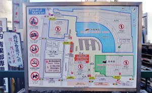 Map of Tsukiji fish market, Tokyo. Separate areas for fish and vegetables are indicated, as well as locations of the entrance gates and the outer market shopping area. For more information, and links to Google maps, see: How to visit Tsukiji fish market (Tsukiji fish market map) 築地市場を訪問する方法