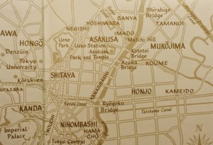 Map of Yoshiwara and Sanya, Tokyo, after 1923. Other items of note on this map are: Ueno Park, Asakusa, Kanda, Ryōgoku, Nihonbashi, Imperial Palace, and Shitaya.