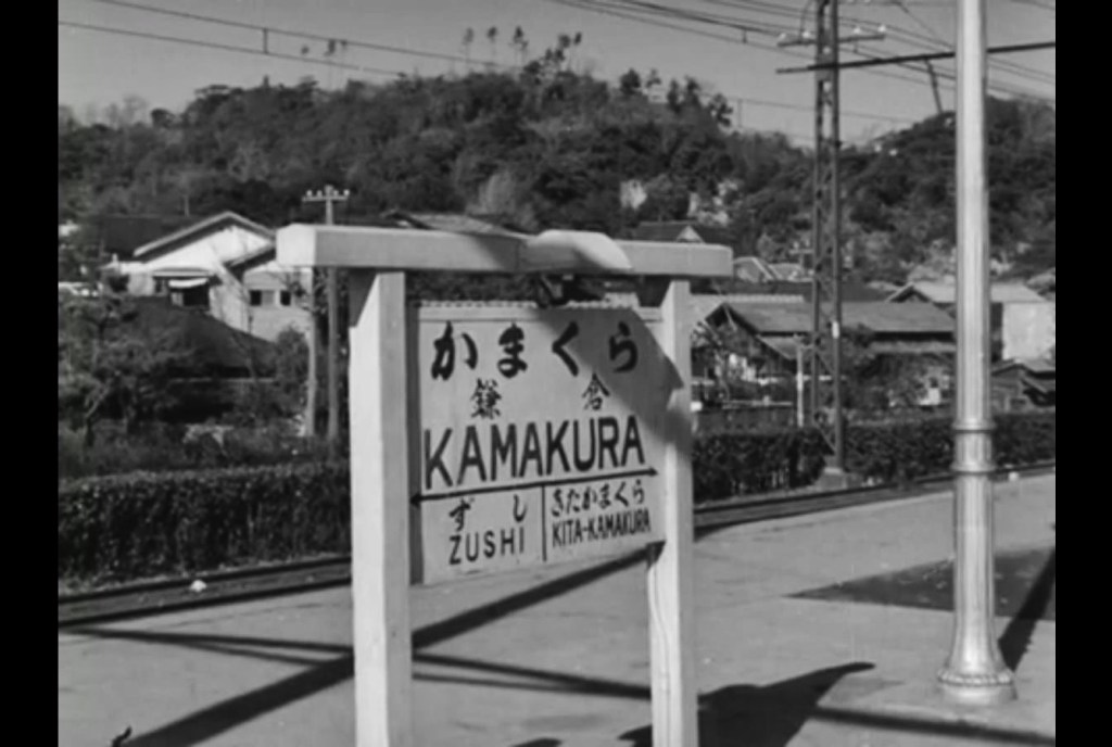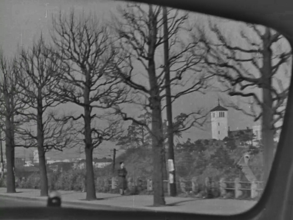 In one scene, two of the characters (played by Setsuko Hara 原 節子 and Sō Yamamura 山村聰) ride in a taxi on an excursion to Tokyo. One is lost in thoughts, the other is asleep. They aren’t looking out the window, but I am. Look, a white tower on top of a hill. What an unusual building for Japan. And is that a cross? It must be a Christian church. Perhaps it’s related to one of the several schools in Tokyo that were established by Christian missionaries in the early 20th century. Judging from its elevation and the gully between the road and the hill it could be…yes, it is Sophia University 上智大学 in Yotsuya, on the east side of Yotsuya Station 四ツ谷駅 (map).