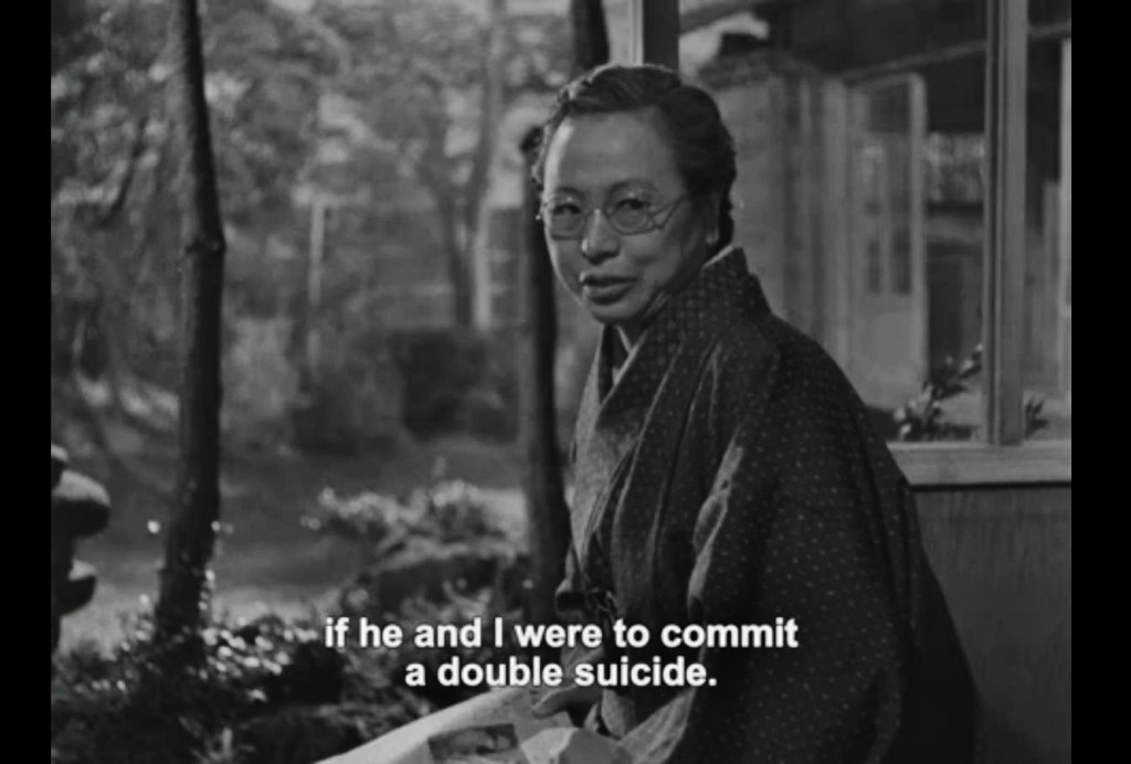 A traditional Japanese house nestled in the hills of Kamakura provides a tranquil setting for Sound of the Mountain 山の音 (Yama no Oto), a 1954 family drama directed by Mikio Naruse 成瀬 巳喜男. Like the house, the elderly mother and father are slowly and steadily aging, following routines established over the course of years. Living with them is their philandering son and his quietly suffering wife, whom the father cherishes more than his own daughter. The son, played by Ken Uehara 上原謙, is cold and cruel, both to his wife and to his mistress. Uehara’s face, voice, and demeanor convey a narcissistic intensity surprising for a film from this era. Sound of the Mountain is consistent with Naruse’s reputation as a somewhat bleak filmmaker, yet it has a buoyant heart and moments of black comedy. After reading a newspaper article about an old couple who commit suicide, she remarks, casually, almost gleefully, “Father was just saying what sort of will we would write if he and I were to commit a double suicide.”