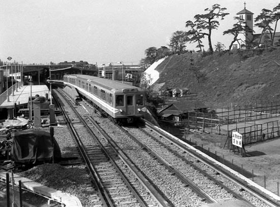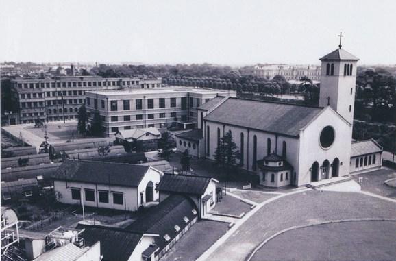 Trust, but verify. It isn’t actually Sophia University, but rather the Church of St. Ignatius 聖イグナチオ教会 (aka Kojimachi Catholic Church, which is located at the northern end of Sophia and is also administered by the Society of Jesus (aka the Jesuits). The church, constructed in 1949, is seen below in two photos from the same era. The first, from 1959*, shows a train heading north into Yotsuya Station, with the church on the hill to the east. The second, from 1955, is an aerial shot facing southwest. In the distance, just to the left of the church tower, is Akasaka Palace 赤坂離宮 (aka the State Guest House 迎賓館).