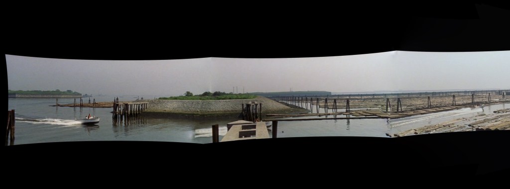 I wanted absolute proof that I’d found the correct location, particularly in light of the Kiba fiasco. I’m indebted to the author of Exhibit C, and also to a blog that posted a series of pictures depicting changes to Odaiba between 1947 and 2007. Here are two of the pictures, in which similarities to the movie stills are evident: the daiba, the large number of logs, and the narrow channel running between the two thin islands.