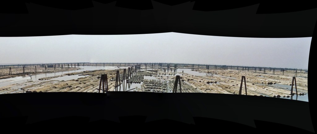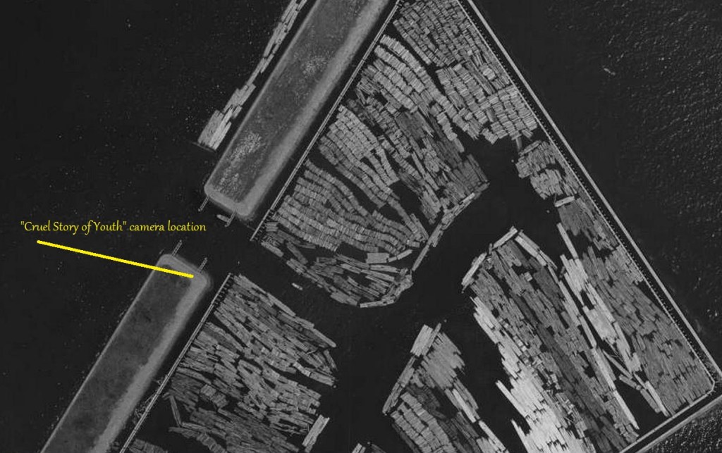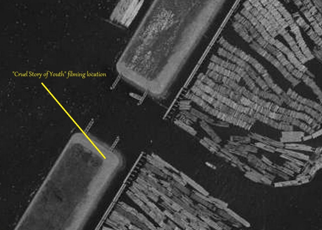 In a prior-post, I described a puzzling scene from Cruel Story of Youth (1960) 青春残酷物語, which shows a boat passing by wooden pilings and into a large pool filled with floating logs. Here, in consecutive photos, is a full sweep of the scene: