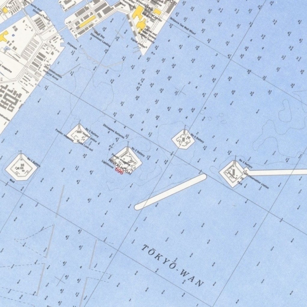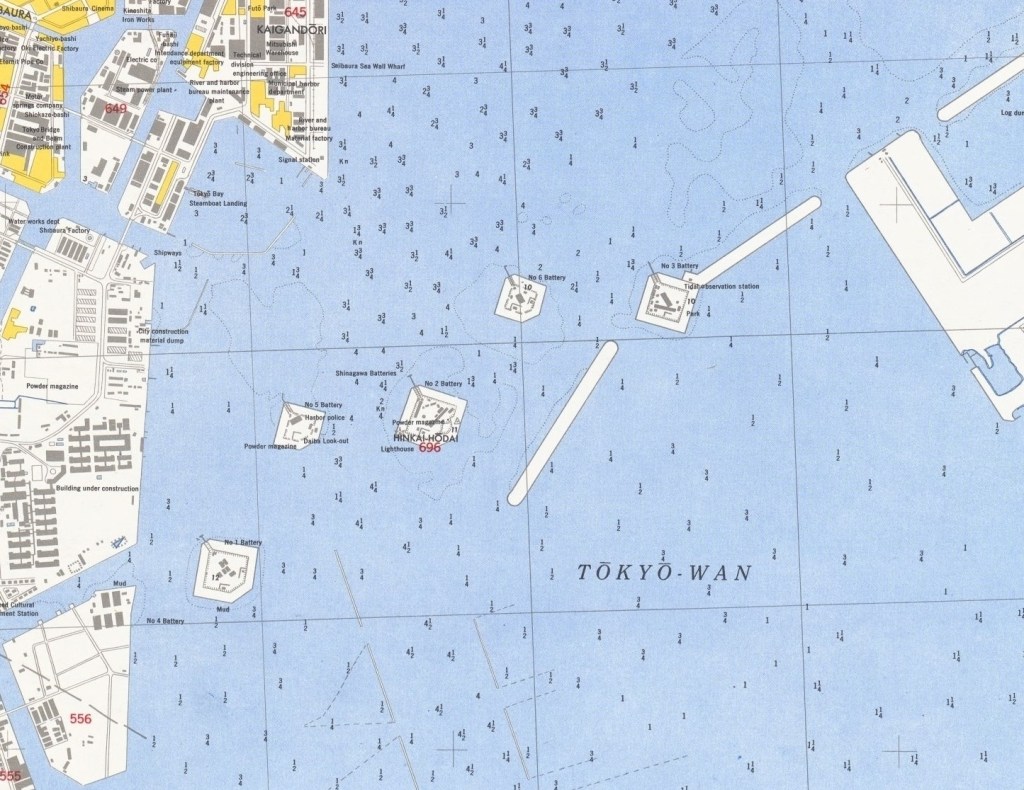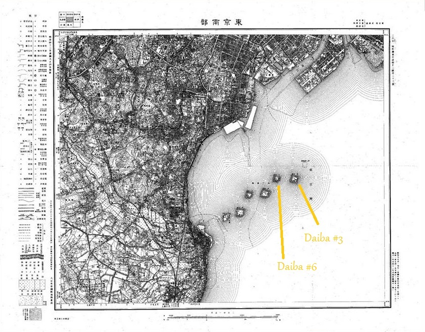 As recently as 1946, most of the Daiba still existed. Below, right, is detail of a US Army map from 1946, showing that all of the daiba but #7 were visible (although #4 had been incorporated into the tip of Tennōzu Isle 天王洲アイル, now the location of Sea Fort Square シーフォートスクエア, map).