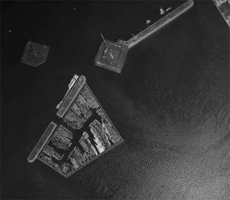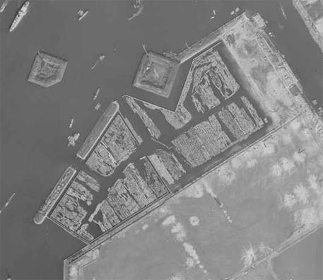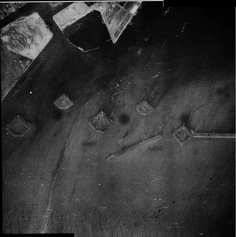 The daiba are clearly visible in the following aerial photograph from 1936, with a comparison to the 1946 map.