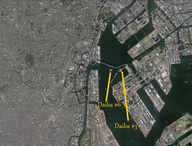 Of the seven daiba that were built (not all were finished), only two remain. The others were either covered by man-made land or removed to improve shipping lanes. Below left (Exhibit C), is a map of the daiba, numbered in red, with yellow circles indicating the ones that no longer exist. Only #3 and #6 remain. #3 is open to the public, known as Daiba Park 台場公園 (map).