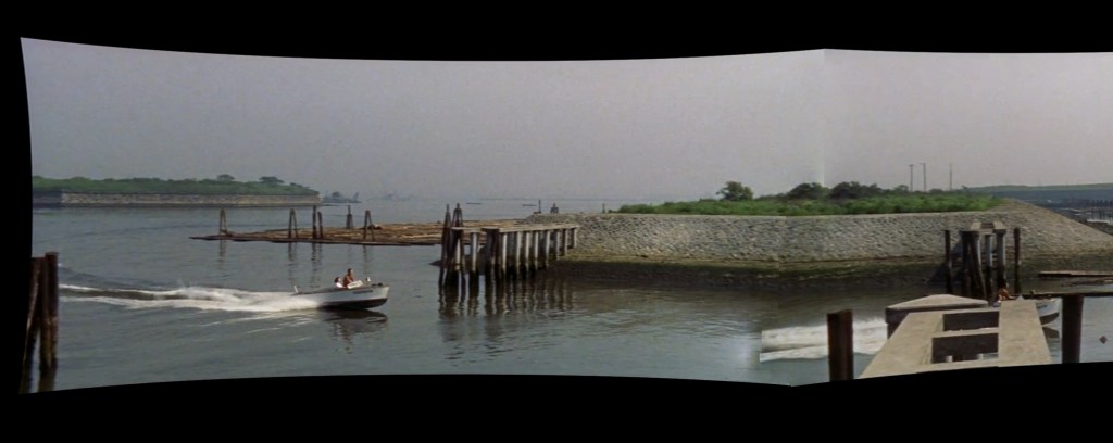 The clues that allowed me to claim victory are the four rows of wooden pilings that jut into the water in the gap between the two thin islands. For the movie, the camera likely was placed on top of the pilings due to the flat surface. Today, the pilings no longer exist, but they were quite visible in the photos from 1963 and 1966; the ladder-like gaps running down the middle of each series is the final, decisive detail.