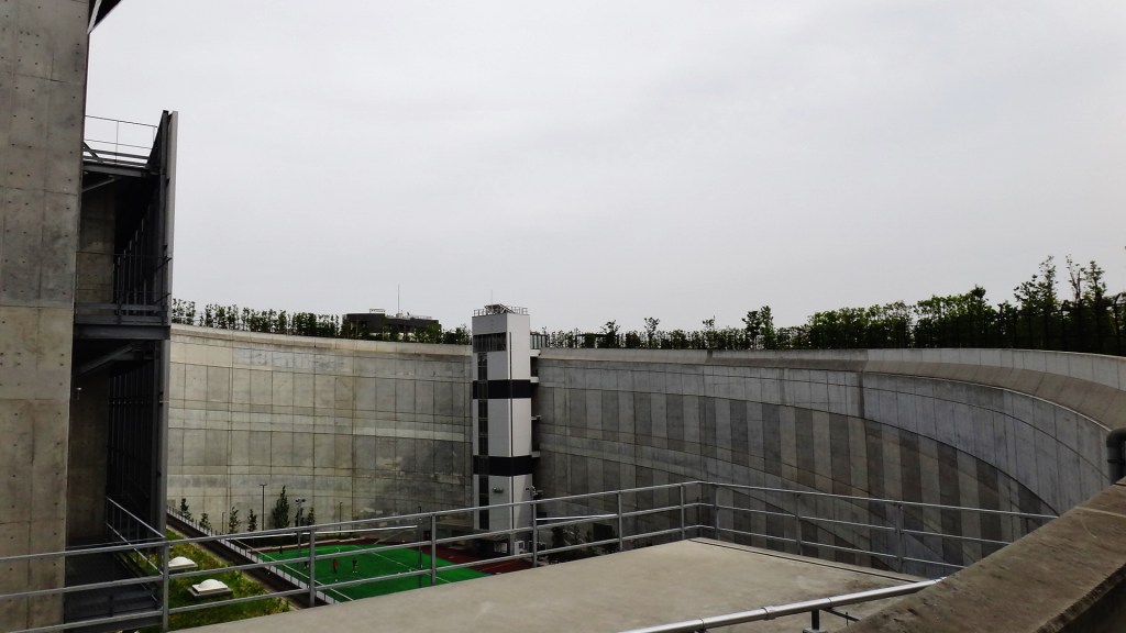 I took another elevator down from the middle of the Sky Garden to the ground level. In the center of the oval, surrounded on all sides by the massive highway wall, is a soccer field. It was fairly well-used when I visited in June, but I suspect it will gain in popularity as it become better known. According to the Meguro city website, the field is open from 7 am to 7 pm from April-October, and from 7:00 a.m. to 5:00 p.m. from November to March.