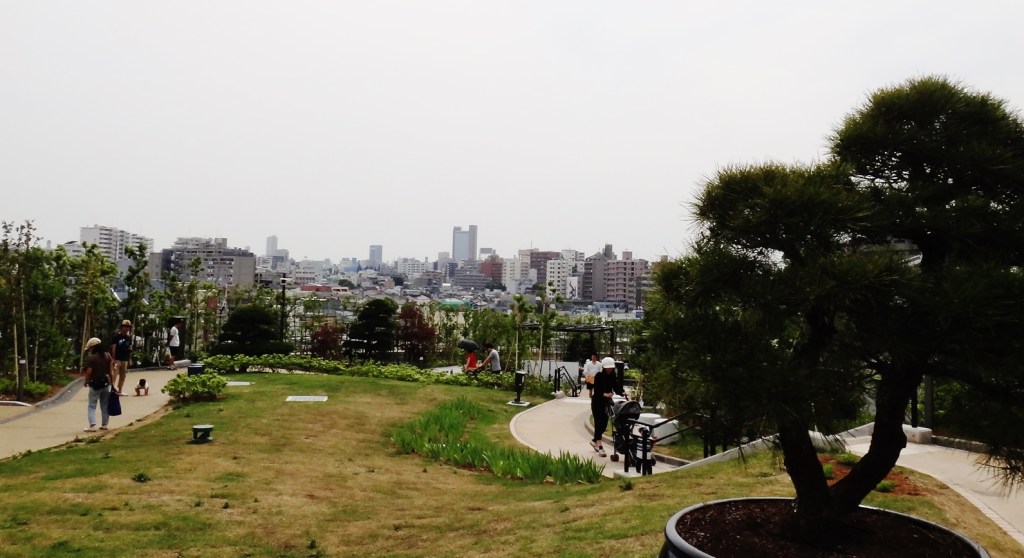 A recent project in Tokyo shows you can have your highway and eat quietly beside it too. One mile southwest of Shibuya Station, thousands of cars spiral through Ohashi Junction without disturbing the peace of the neighborhood. The site is named “O-Path Meguro Ohashi”「O-Path目黒大橋」, in reference, I assume, to the oval shape of the junction (Note 2). The site is also called Ohashi Green Junction 大橋グリーンジャンクション due to “green” elements of the project such as the park that sites on the roof of the structure.