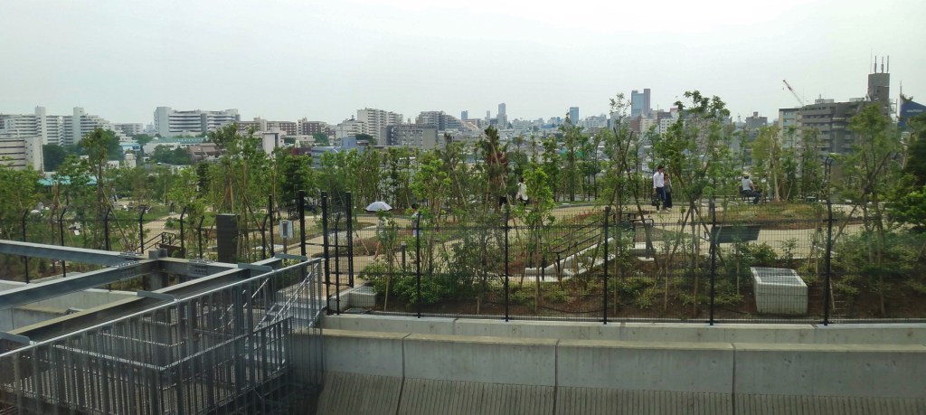 At the “top” of the curve, the path ends at a fence, next to the ventilation system the cleans the air of the highway beneath your feet. On top of the ventilation system are two small pools of water that I mistook for a drainage system (below, left). In fact, it is a “Roof Garden for Conservation of Biodiversity”, known as Ohashi Sato no Mori「おおはし里の杜」. According topromotional materials, the purpose was to “recreate the original landscape of the area, providing local children with the chance to plant rice the traditional way in the green space’s paddy field.”