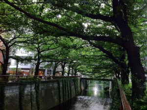 Leafy trees cover the Meguro River in Nakameguro. In the spring, these cherry trees are a popular Hanami location. See: Planting rice on the highway: Ohashi Green Junction