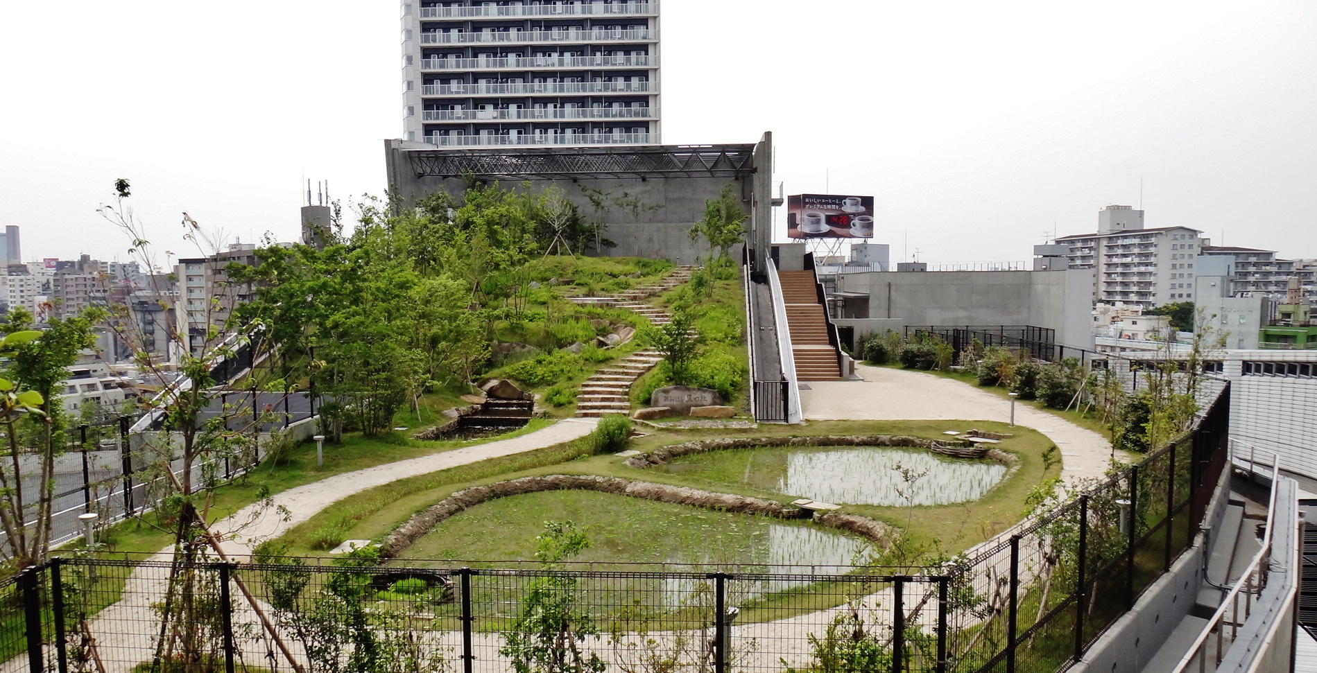 The drainage pool on top of a structure that houses a highway interchange. In the middle of the structure is a soccer field, and on top is a park. This is known as “O-Path Meguro Ohashi”「O-Path目黒大橋」, aka Ohashi Green Junction 大橋グリーンジャンクション. See: Planting rice on the highway: Ohashi Green Junction 大橋グリーンジャンクション