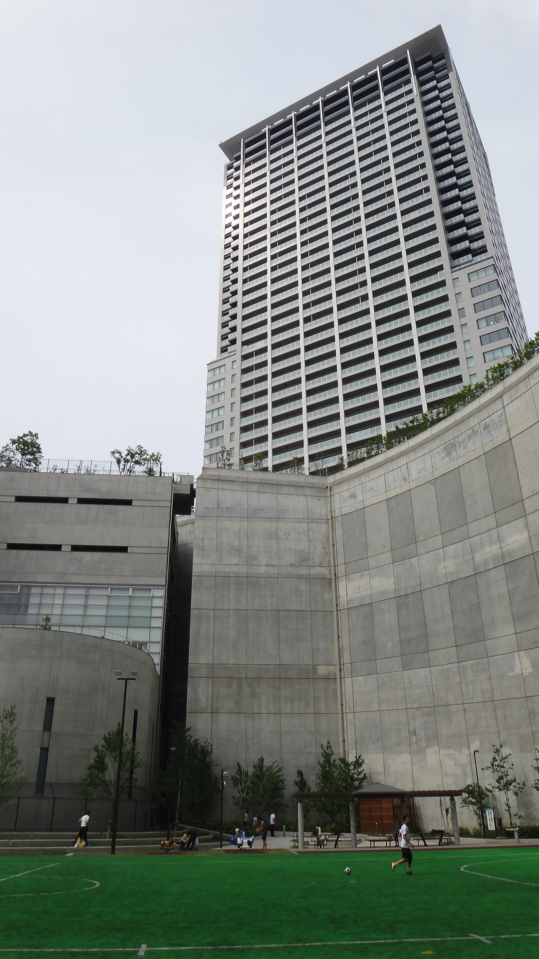 Cross Air Tower rises above the curved walls of a structure that houses a highway interchange. In the middle of the structure is a soccer field, and on top is a park. This is known as “O-Path Meguro Ohashi”「O-Path目黒大橋」, aka Ohashi Green Junction 大橋グリーンジャンクション. See: Planting rice on the highway: Ohashi Green Junction 大橋グリーンジャンクション