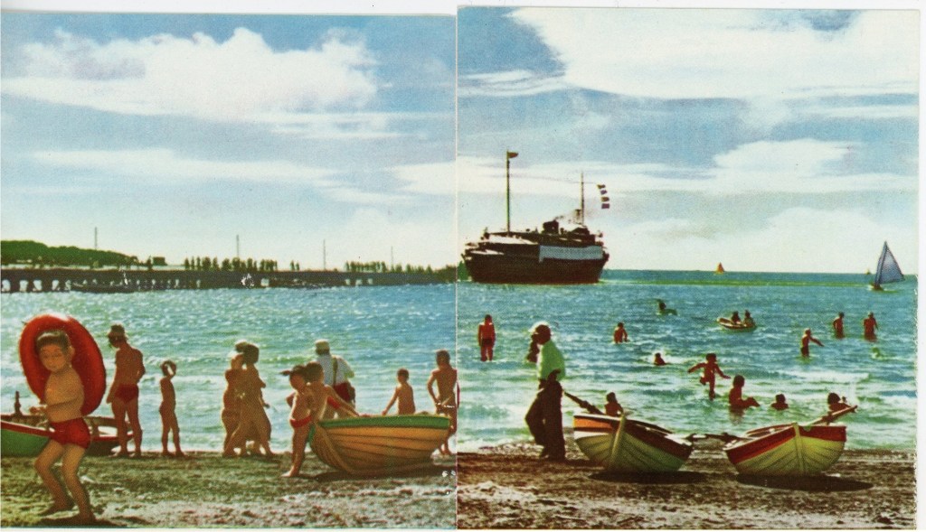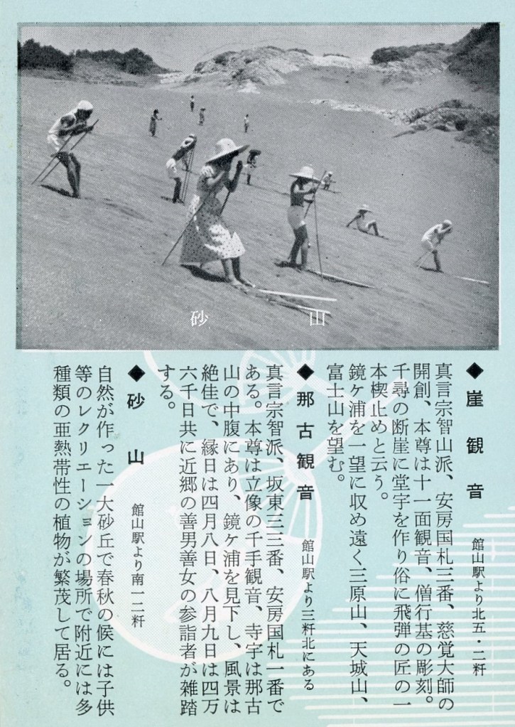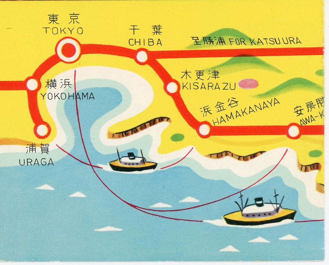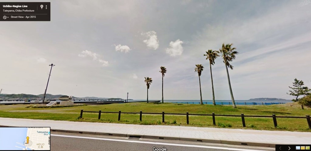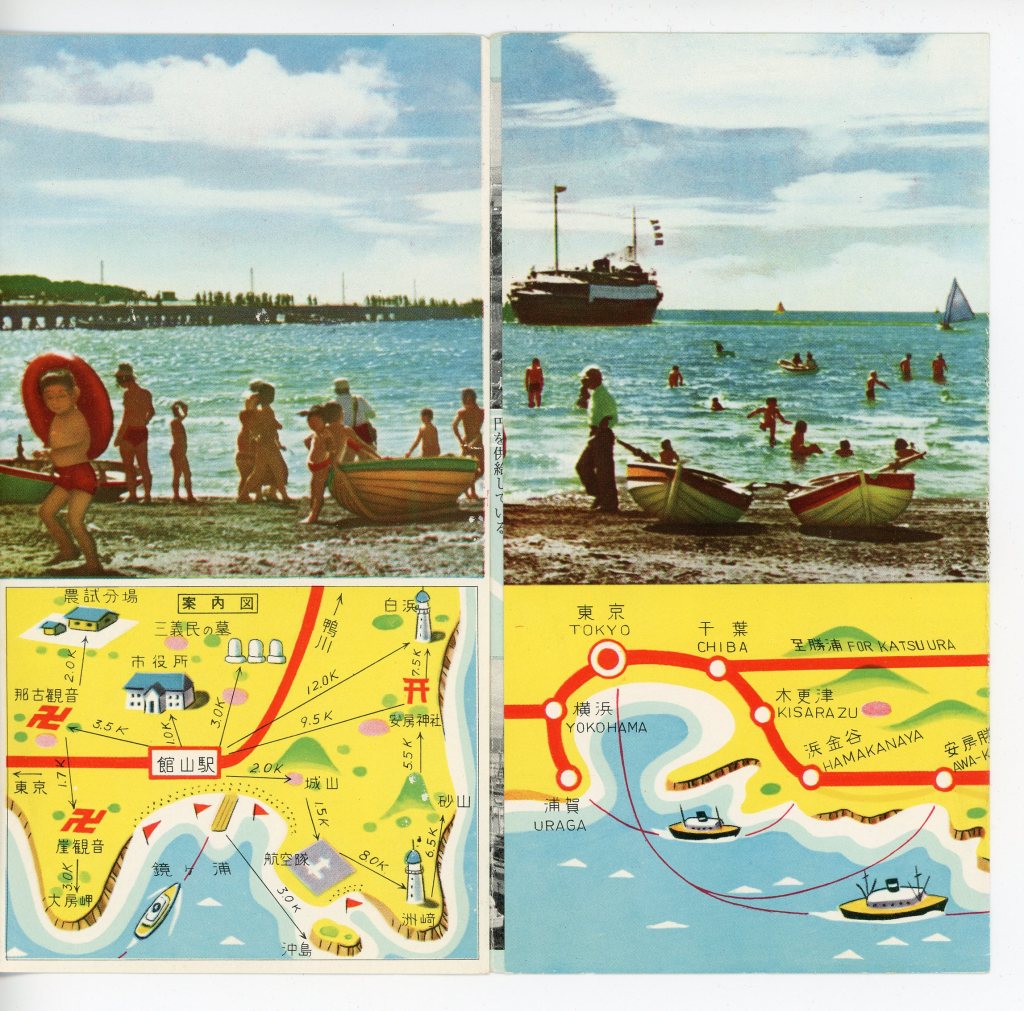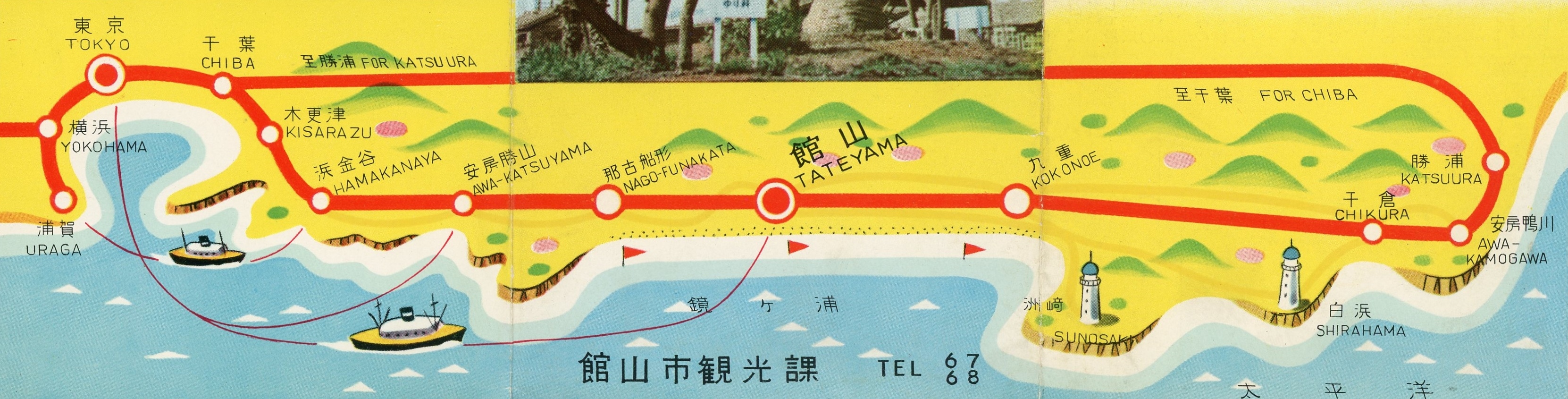 There used to be a ferry from Tokyo to Tateyama (pier seen above), but today it’s a little more complicated. You can recreate some of the magic by taking the Tokyo Wan Ferry from Kurihama 久里浜 (south of Yokohama) to Kanaya 金谷, in Chiba (map). It takes 35 minutes from Hama-Kanaya Station 浜金谷駅 to Tateyama Station 館山駅 via the Uchibo line 内房線. The beach scene in the brochure is located approximately here (map).