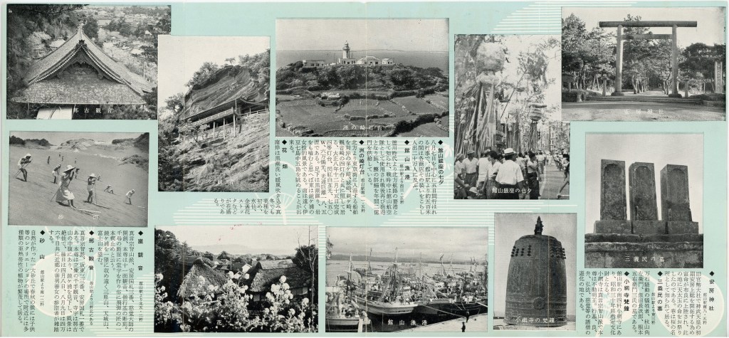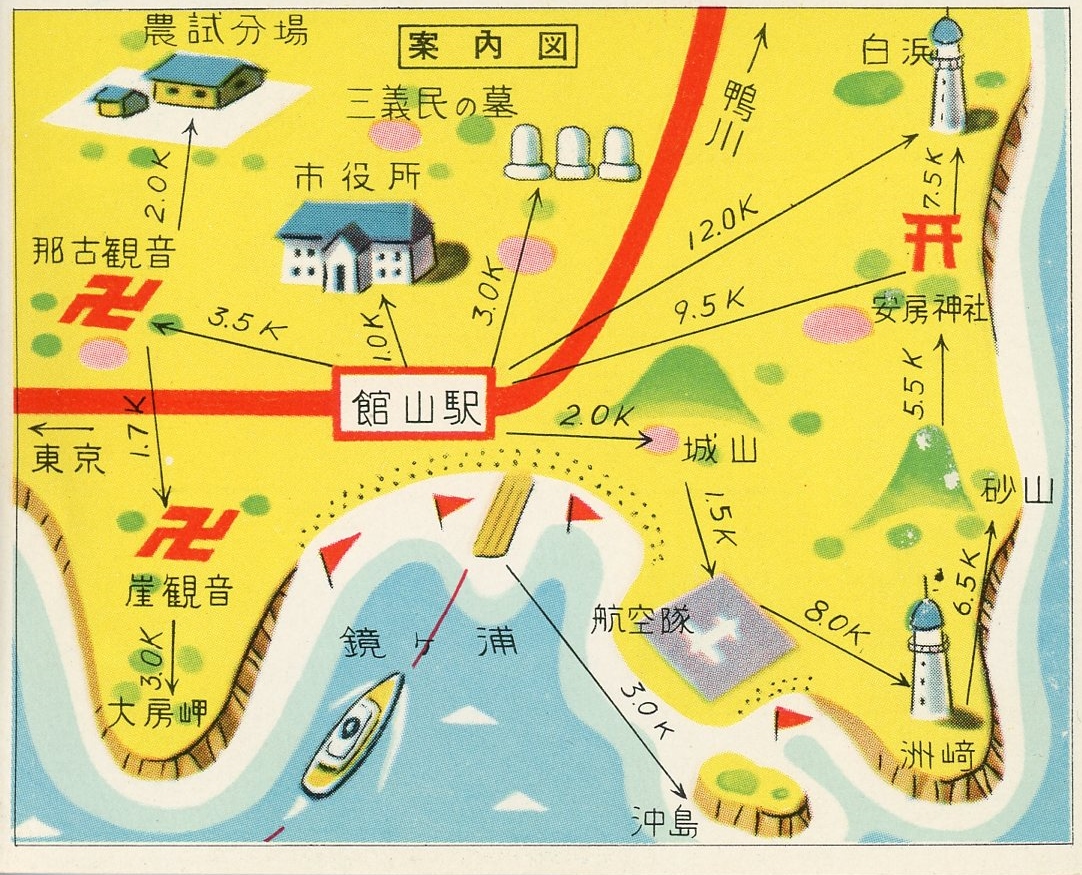 Tateyama 館山, at the southern tip of Chiba’s Bōsō Peninsula 房総半島 (map) is probably overlooked by most Tokyoites. Too close for vacation, yet too far for a day trip to be convenient. I’ve never been. But now I want to, courtesy of a vintage tourist brochure I picked up at a Shimbashi flea market.
