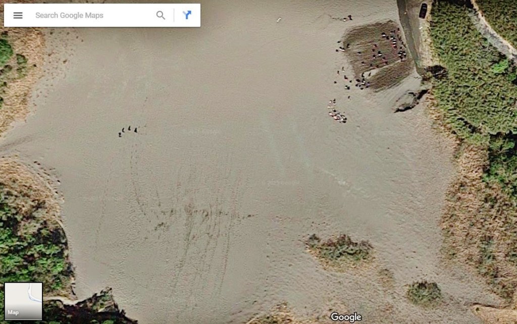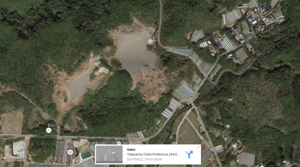 I thank these old-timey sand skiers for letting me know about this diversion. The Tateyama city website (in Japanese) provides information and directions to the sand skiing site. As seen in satellite images, the sand still gets good use. The dunes are situated just north (inland) of the Tateyama Country Club 館山カントリークラブ. There are two slopes, both located here (map).