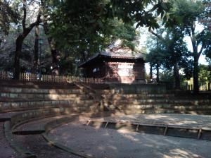 Hachiman shrine 世田谷八幡宮 in Setagaya, Tokyo (map). Seen here is a ceremonial sumo wrestling ring. The sport of sumo has its roots in the Japanese Shinto religion, as it was first performed on the grounds of a shinto shrines. Nearby this shrine is the Setagaya streetcar; read more at: Monorails and more: Tokyo’s amusing train lines