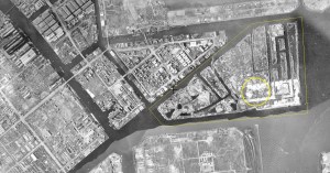 Aerial photograph of a section of Koto-ku, Tokyo. This is a former landfill and then the site of the second-generation of “Ants Villa”, a church and community for members of the underclass of Tokyo.
