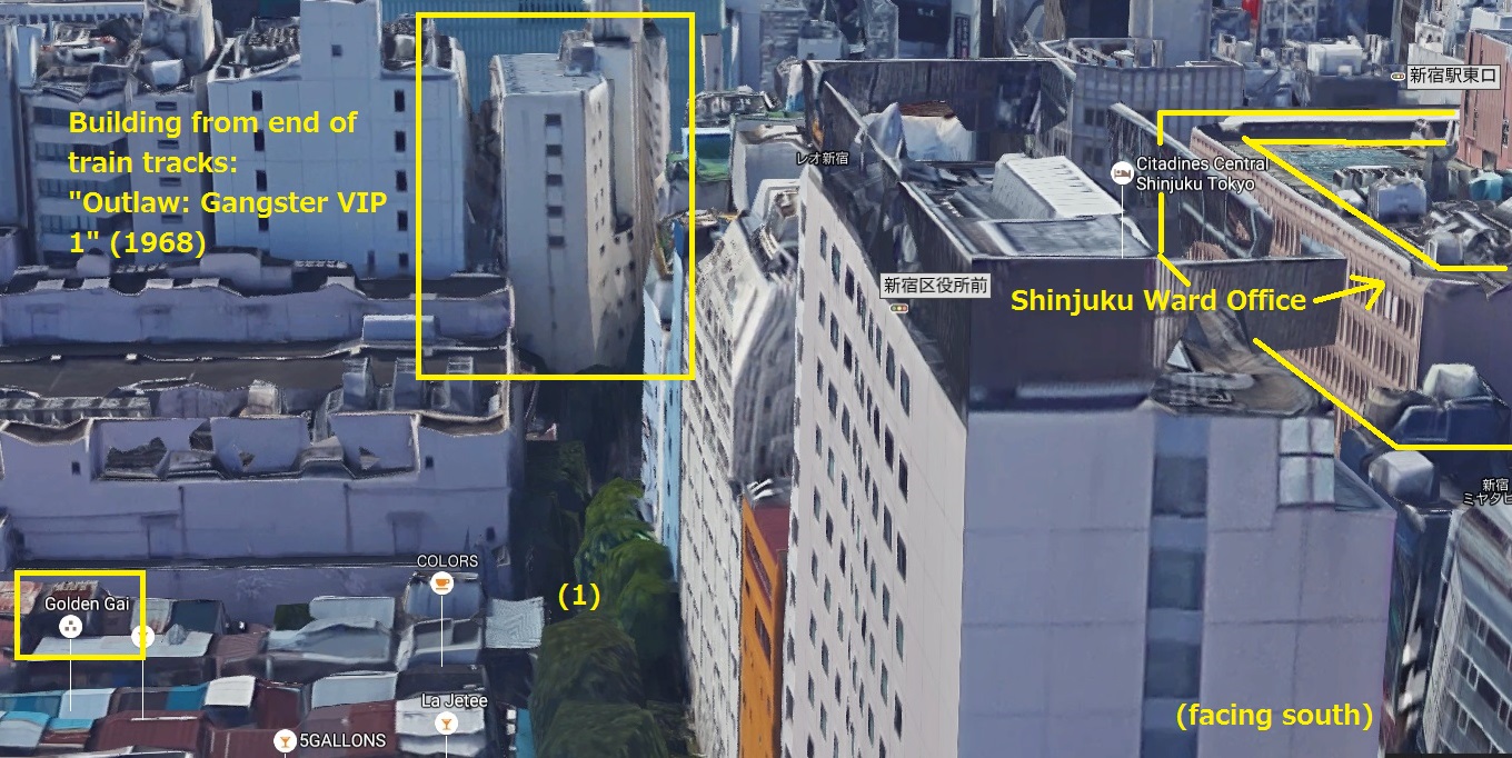 Annotated aerial view of the old route of the Toden streetcar in Shinjuku. This was long removed and is now Shinjuku Esplanade Park 「新宿遊歩道公園四季の道」, a green “S” that cuts through the drab Shinjuku cityscape. It was built in 1974 following the removal of the Toden streetcar. The yellow lines are included for reference. See: From train to tree: Golden Gai, Toden streetcar, and Shinjuku Promenade Park