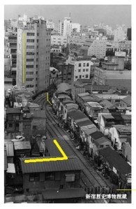 Old route of the Toden streetcar in Shinjuku. This was long removed and is now Shinjuku Esplanade Park 「新宿遊歩道公園四季の道」, a green “S” that cuts through the drab Shinjuku cityscape. It was built in 1974 following the removal of the Toden streetcar. The yellow lines are included for reference. See: From train to tree: Golden Gai, Toden streetcar, and Shinjuku Promenade Park